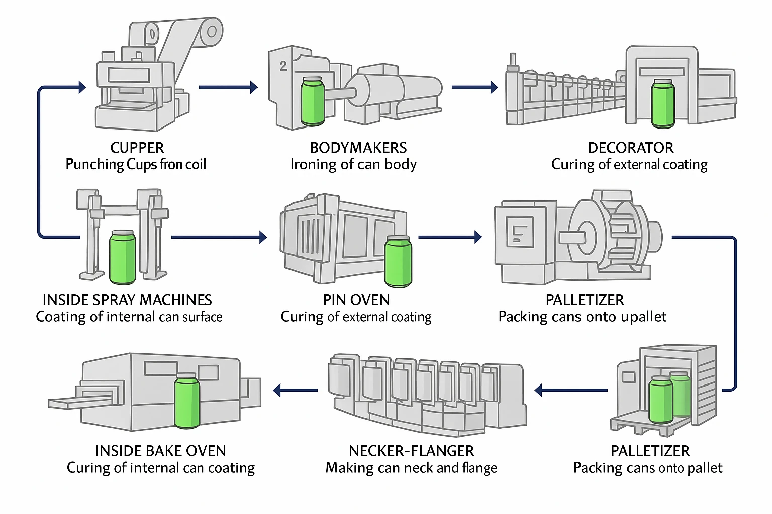 | 9 | Palletizer | Packs finished cans onto pallets for storage and shipment. |